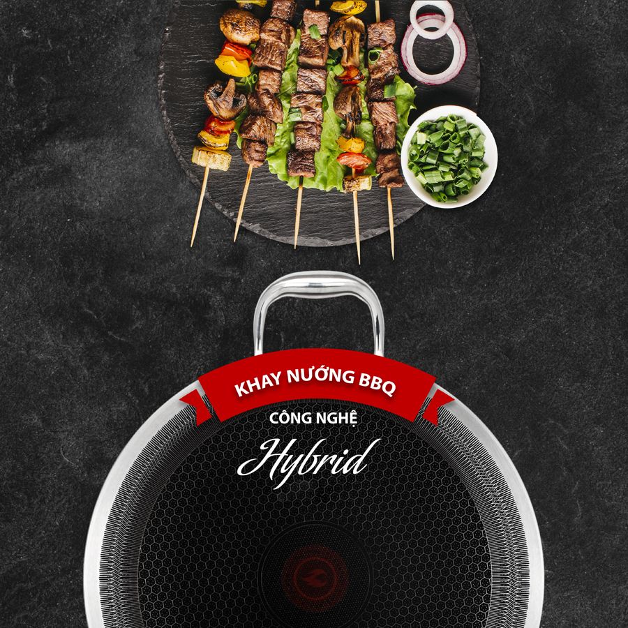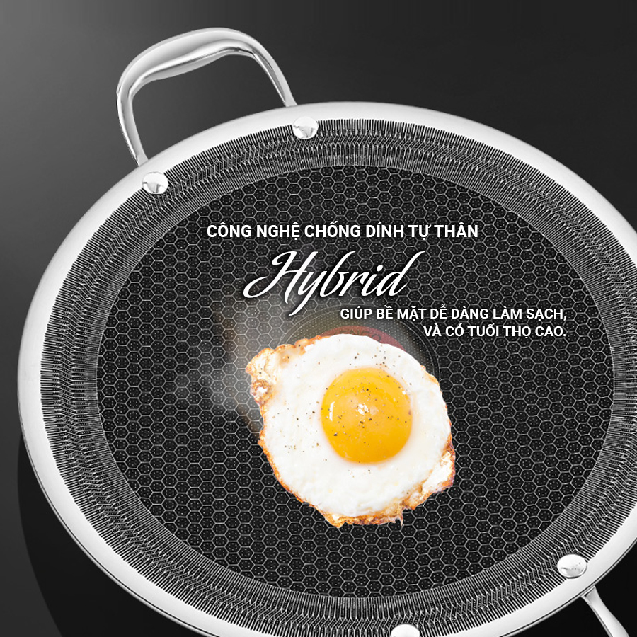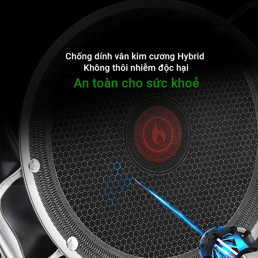 Tính Năng Chống Dính Tối Ưu: Sử dụng công nghệ khắc vân kim cương Hybrid, tạo ra bề mặt chống dính hiệu quả, giúp thực phẩm không bị bám chặt và dễ dàng làm sạch sau khi sử dụng.