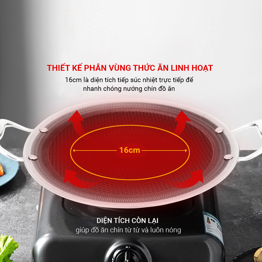 Tiện lợi và linh hoạt: Thiết kế phân vùng thức ăn thông minh, phù hợp với nhiều loại bếp khác nhau, từ gas đến bếp từ.