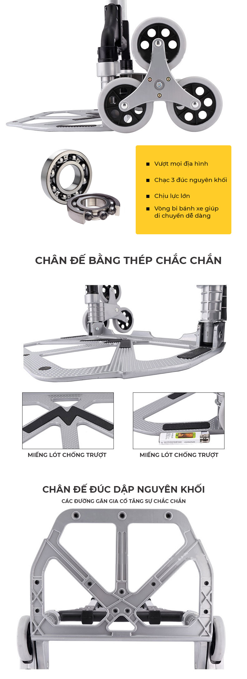 Phần đế chịu lực và khung bánh xe được làm từ nhôm đúc nguyên khối giúp cho xe kéo đẩy hàng có một bộ khung chịu lực tốt có thể kéo được khối lượng hàng lớn ở đường bằng lên tới 100kg và 50kg khi leo lên hoặc xuống cầu thang.