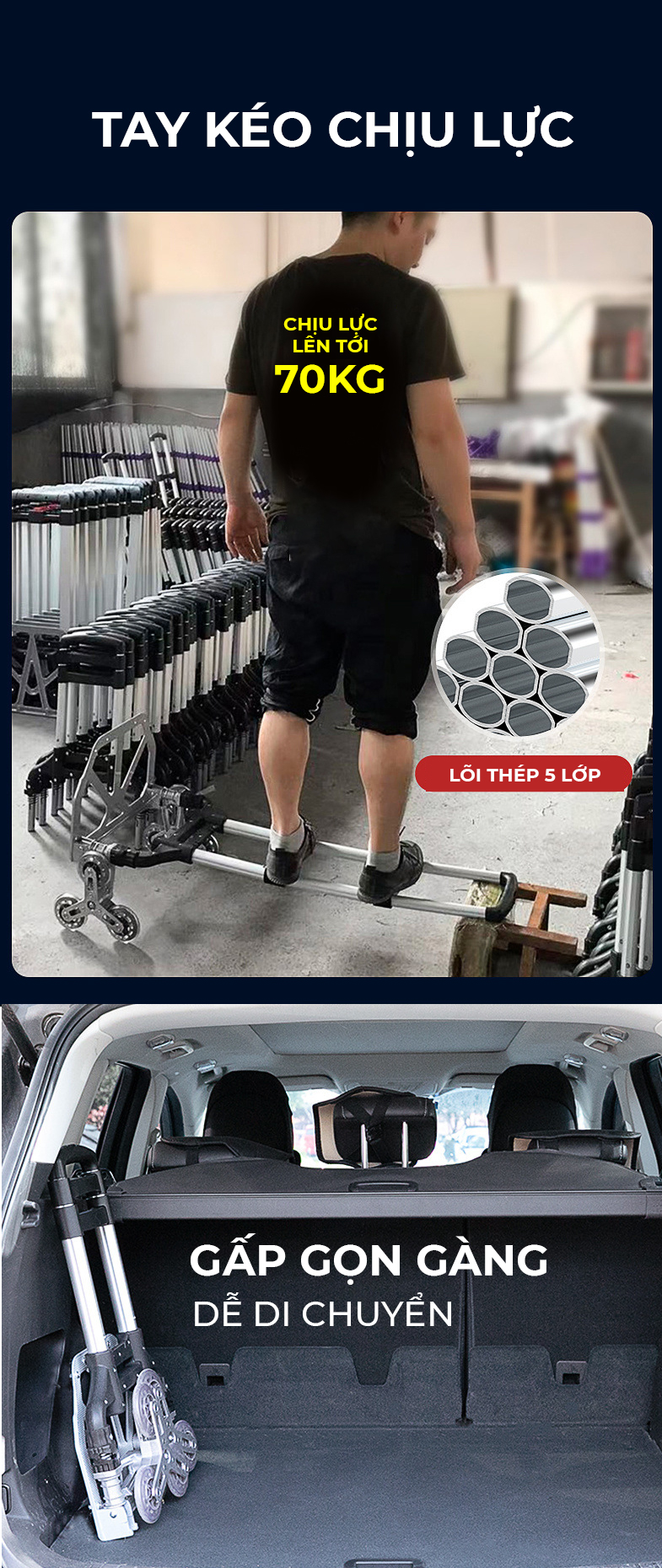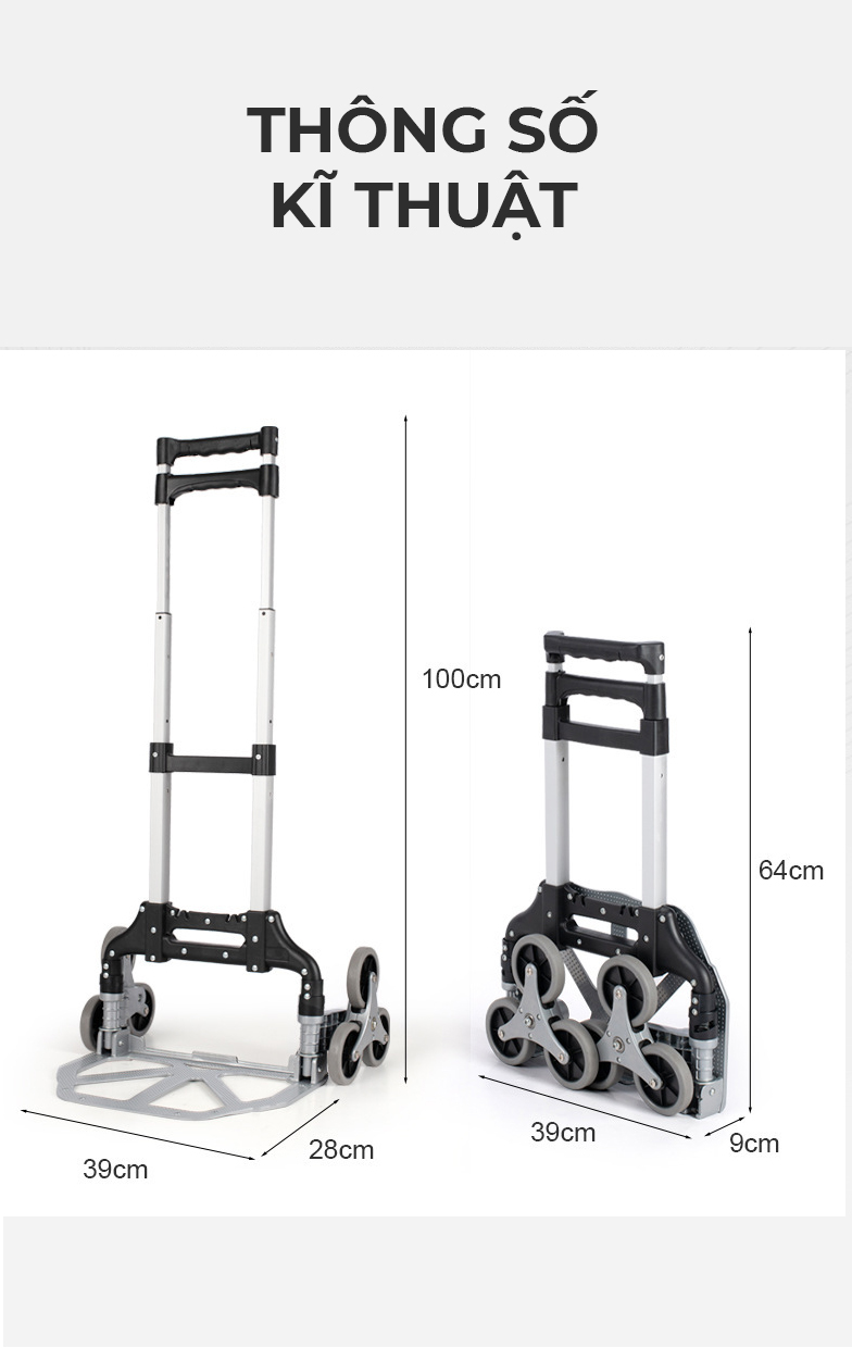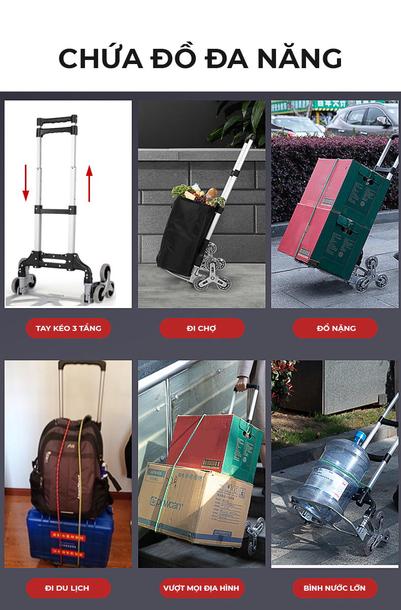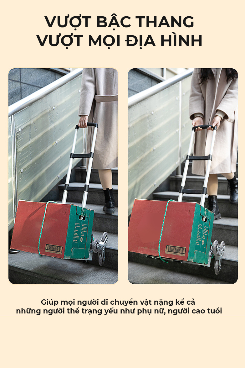 Xe kéo hàng cầu thang thông minh với 6 bánh xe có thể hoạt động tốt với bất kể địa hình nào như: nơi có bề mặt gồ ghề nhiều vật cản, hay đường dốc,... và được sử dụng phổ biến đổi với cầu thang, bậc thềm tam cấp. Ngoài ra, xe kéo có trọng lượng siêu nhẹ, phụ nữ hay người cao tuổi đều có thể sử dụng để di chuyển đồ vật lên các tầng tại nhà vô cùng dễ dàng.