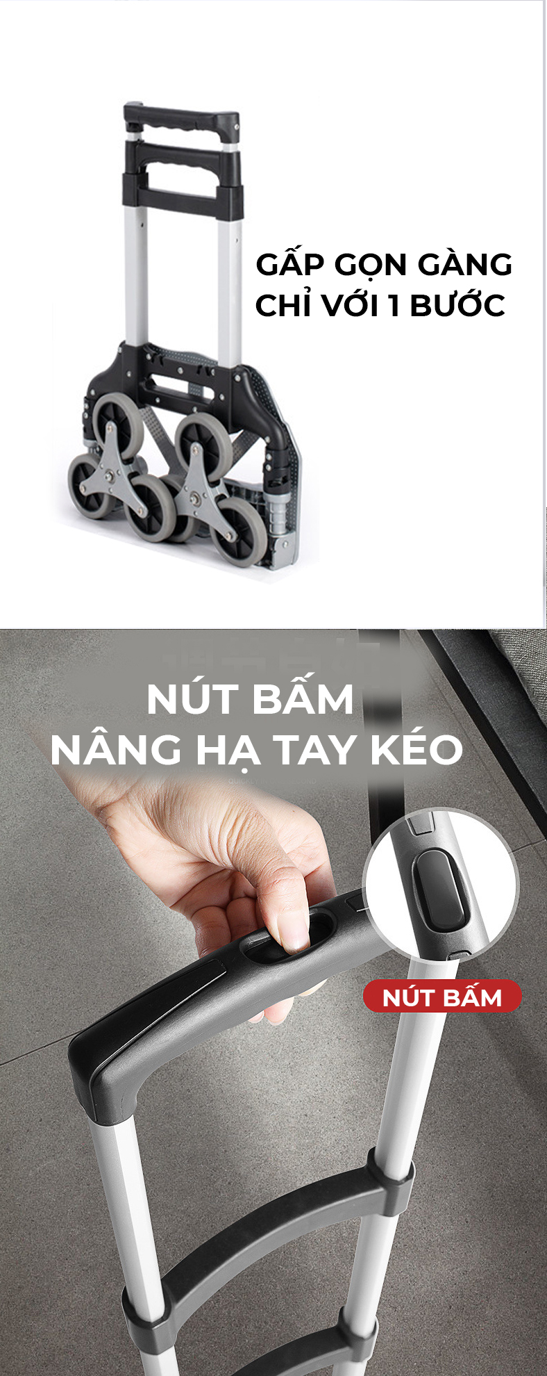 Xe kéo hàng cầu thang hay còn gọi là xe đẩy hàng leo cầu thang. Loại xe chở hàng này được sử dụng 2 bộ xoay bánh xe liên kết với nhau, mỗi bộ phận gồm có 3 bánh nhỏ, không những di chuyển trên bề mặt phẳng mà sản phẩm còn có thể di chuyển trên những bậc thang hay lề đường một cách dễ dàng.