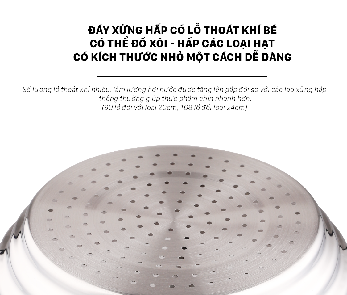 Với phần nắp của xửng hấp, được thể kế theo hình tròn, đường viền bên ngoài được dập đúc theo các size sao cho vừa khớp với ngăn hấp của xửng. Gúp đảm bảo xửng có thể đậy kín hơi để thực phẩm có thể chin nhanh. Phần tay cầm nắp được cách nhiệt chống nóng, bỏng khi cầm nắm sản phẩm.